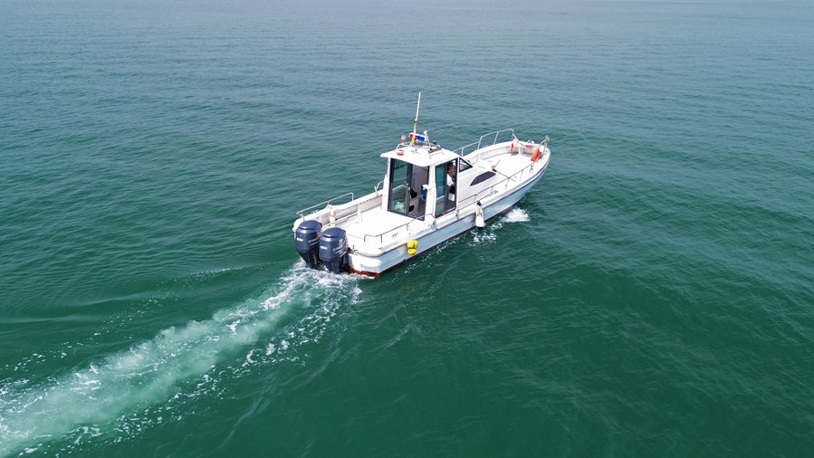 This aerial photo taken on Aug. 15, 2023 shows Liang Zeye patrolling on the water of Changshan islands in Changhai County, Dalian City of northeast China's Liaoning Province. (Xinhua/Chen Wei)