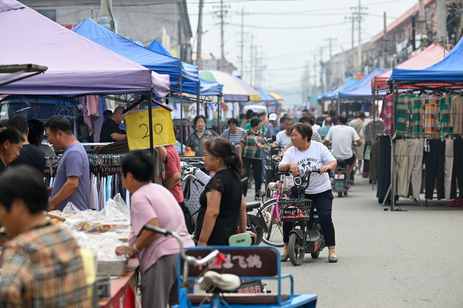Villagers select goods at a rural fair in Taitou Town of Jinghai District in north China's Tianjin Municipality, Aug. 25, 2023. (Xinhua/Sun Fanyue)