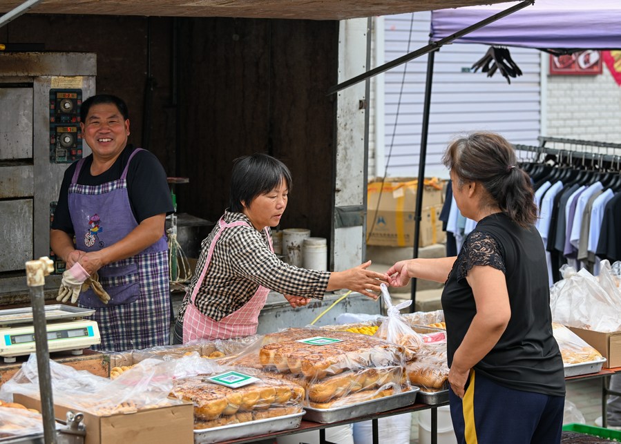 A villager buys goods at a rural fair in Taitou Town of Jinghai District in north China's Tianjin Municipality, Aug. 25, 2023. (Xinhua/Sun Fanyue)