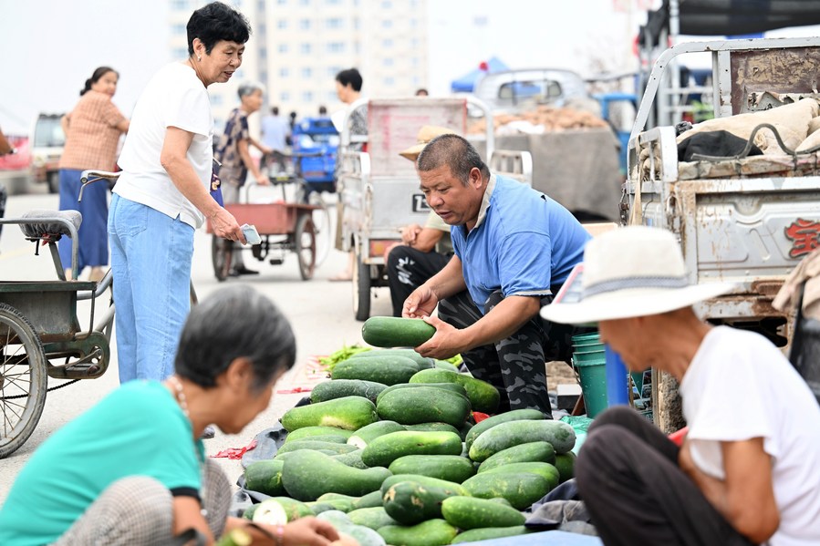 Villagers select vegetables at a rural fair in Taitou Town of Jinghai District in north China's Tianjin Municipality, Aug. 25, 2023. (Xinhua/Zhao Zishuo)