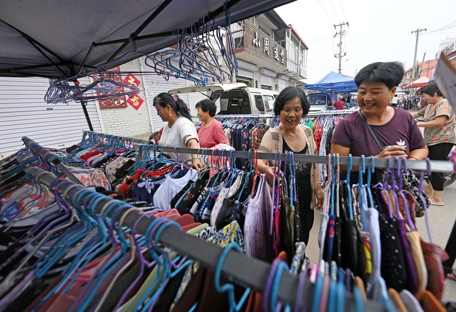 Villagers select clothes at a rural fair in Taitou Town of Jinghai District in north China's Tianjin Municipality, Aug. 25, 2023. (Xinhua/Zhao Zishuo)