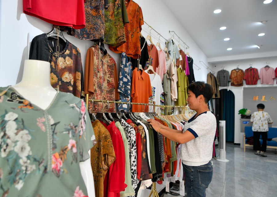 A villager selects clothes at a rural fair in Taitou Town of Jinghai District in north China's Tianjin Municipality, Aug. 25, 2023. (Xinhua/Sun Fanyue)