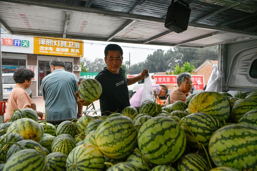 A vendor picks out watermelons for villagers at a rural fair in Taitou Town of Jinghai District in north China's Tianjin Municipality, Aug. 25, 2023. (Xinhua/Sun Fanyue)■
