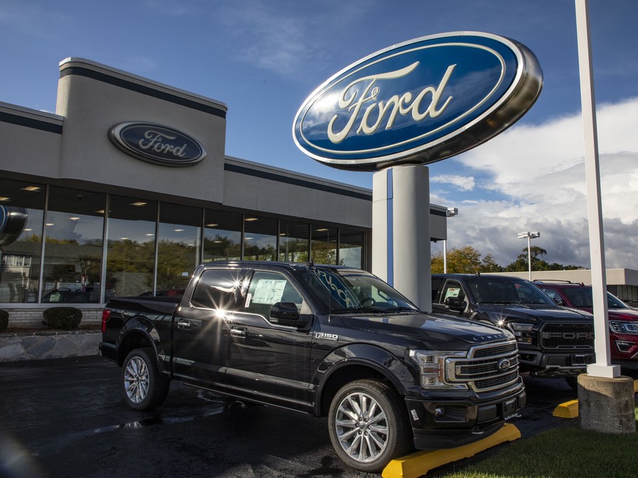 A Ford F-150 (Front) is seen at a Ford dealership in northern suburbs of Chicago, Illinois, the United States, on Oct. 1, 2020. (Photo by Joel Lerner/Xinhua)