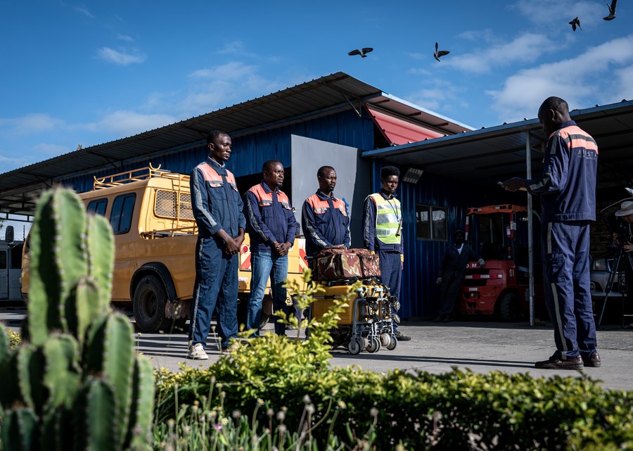 Railway workers listen to rules on operation before their shift in Nairobi, Kenya, May 23, 2023. (Xinhua/Wang Guansen)