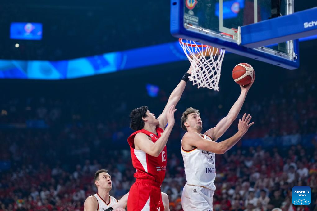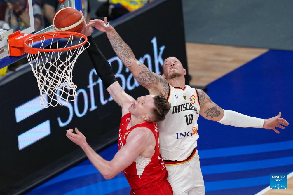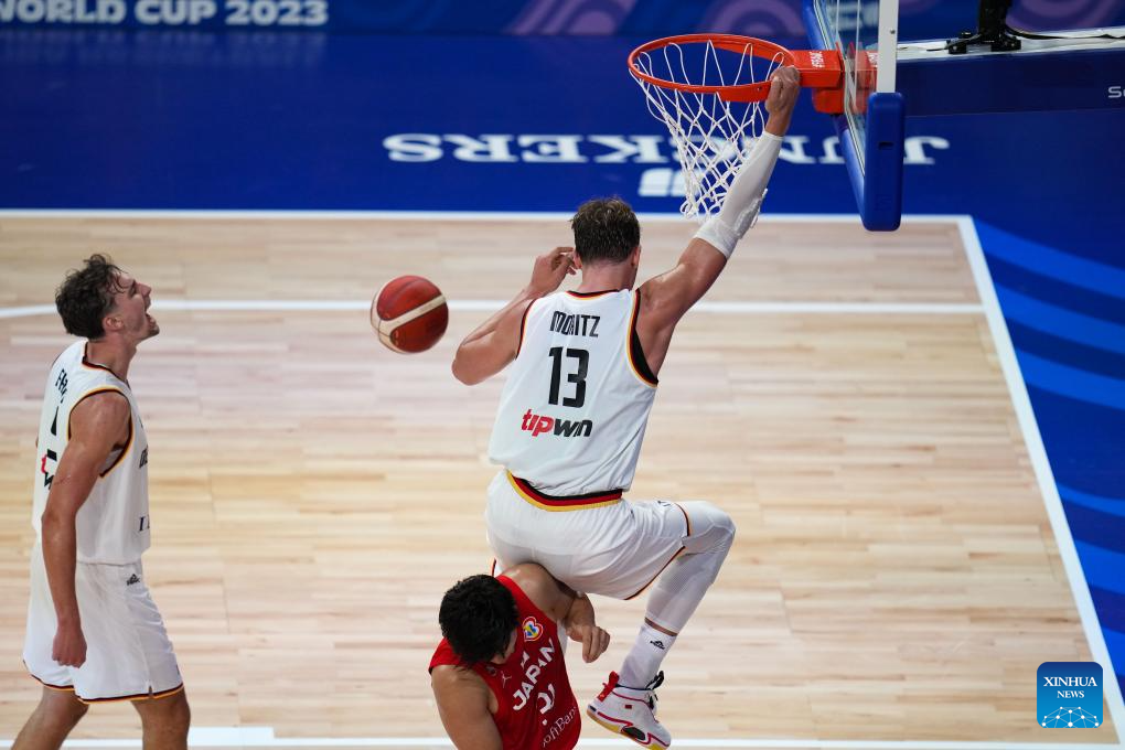 Germany's Moritz Wagner (R) dunks during the group E first round match between Germany and Japan at the FIBA World Cup 2023 in Okinawa, Japan, Aug. 25, 2023. (Xinhua/Zhang Xiaoyu)