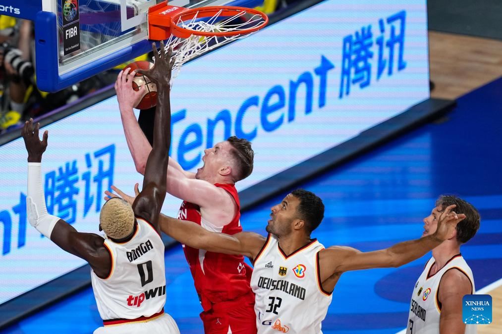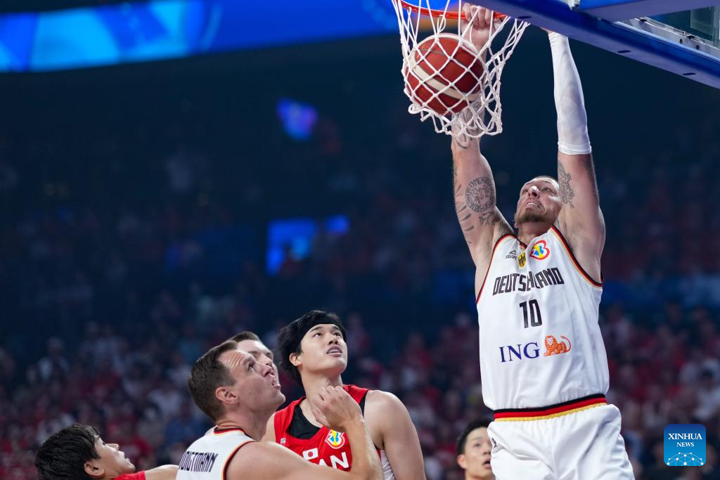Germany's Daniel Theis (1st R) dunks during the group E first round match between Germany and Japan at the FIBA World Cup 2023 in Okinawa, Japan, Aug. 25, 2023. (Xinhua/Zhang Xiaoyu)