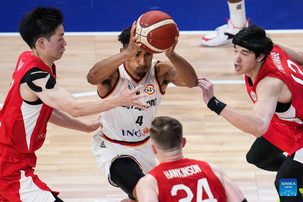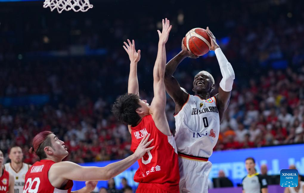 Germany's Maodo Lo (C) breaks through during the group E first round match between Germany and Japan at the FIBA World Cup 2023 in Okinawa, Japan, Aug. 25, 2023. (Xinhua/Zhang Xiaoyu)