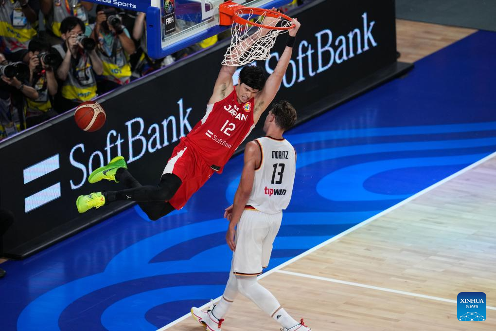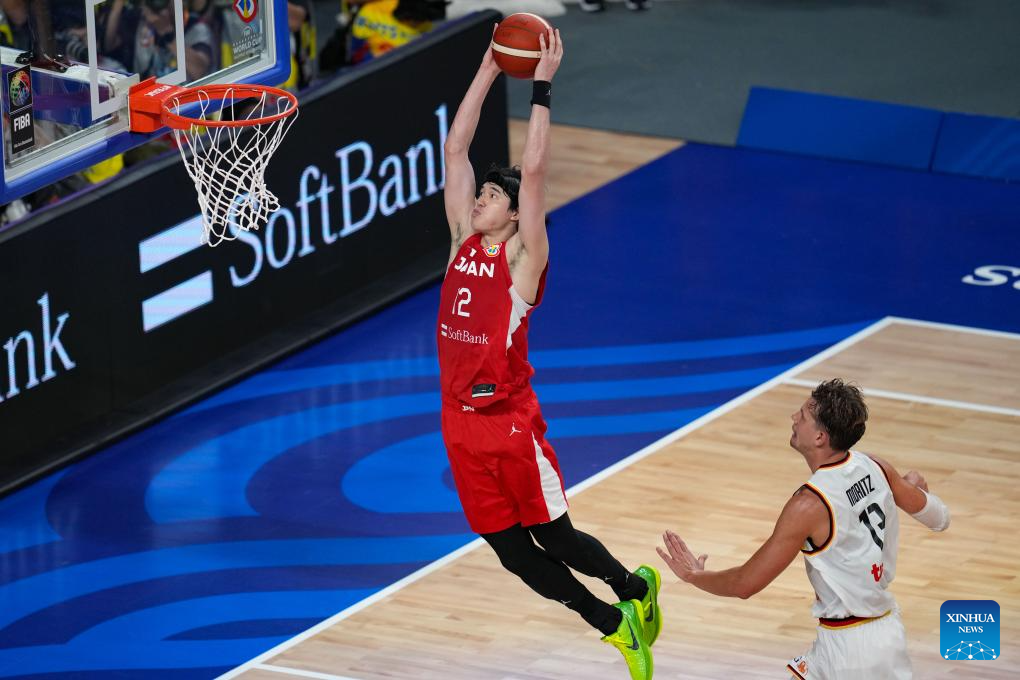 Japan's Watanabe Yuta (L) dunks during the group E first round match between Germany and Japan at the FIBA World Cup 2023 in Okinawa, Japan, Aug. 25, 2023. (Xinhua/Zhang Xiaoyu)