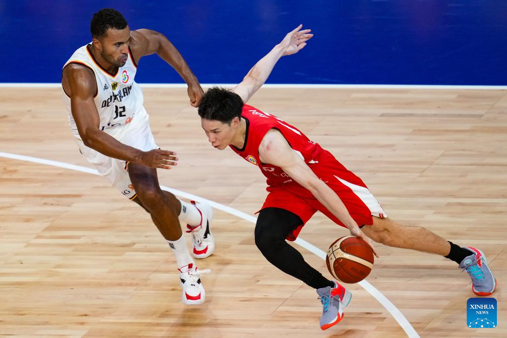 Japan's Baba Yudai (R) breaks through during the group E first round match between Germany and Japan at the FIBA World Cup 2023 in Okinawa, Japan, Aug. 25, 2023. (Xinhua/Zhang Xiaoyu)