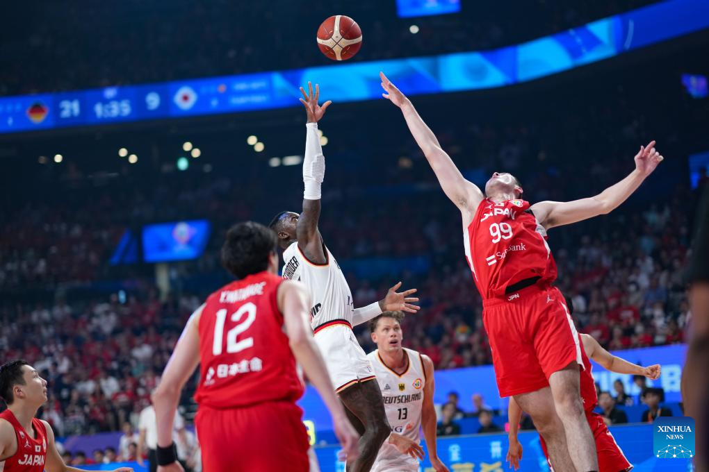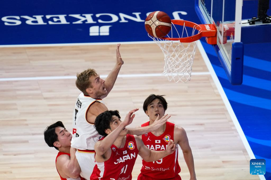Germany's Niels Giffey (2nd L) vies for a rebound during the group E first round match between Germany and Japan at the FIBA World Cup 2023 in Okinawa, Japan, Aug. 25, 2023. (Xinhua/Zhang Xiaoyu)