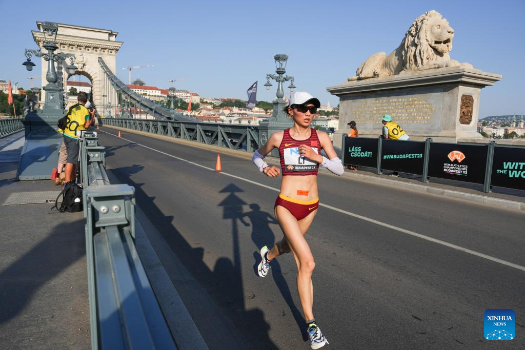 China's Li Zhixuan runs on the Chain Bridge during the women's marathon at the World Athletics Championships in Budapest, Hungary, Aug. 26, 2023. (Xinhua/Zheng Huansong)