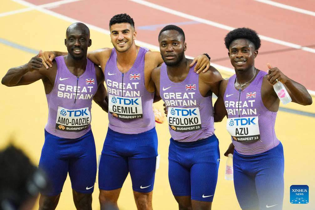 Eugene Amo-Dazie, Adam Gemili, Jona Efoloko and Jeremiah Azu (L to R) of Great Britain celebrate after the men's 4x100m Relay heats of the World Athletics Championships Budapest 2023 in Budapest, Hungary on Aug. 25, 2023. (Xinhua/Zheng Huansong)