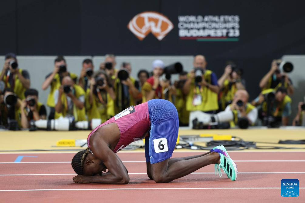 Noah Lyles of the United States celebrates after winning the men's 200m final during the World Athletics Championships in Budapest, Hungary, Aug. 25, 2023. (Xinhua/Song Yanhua)