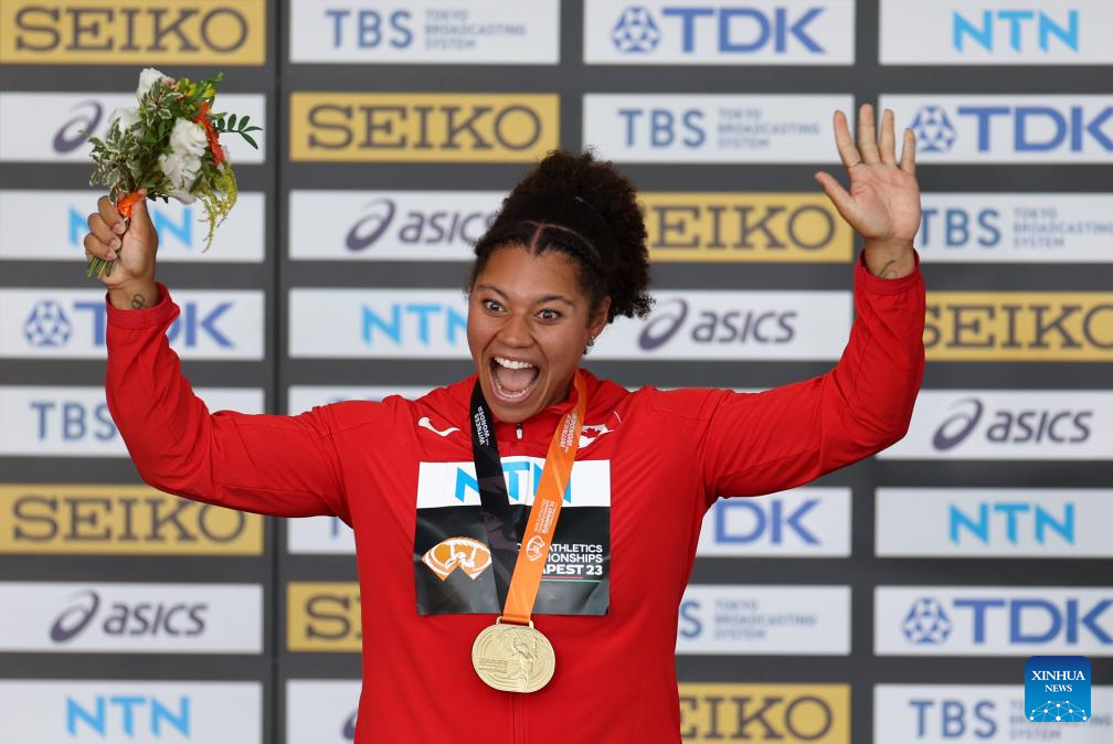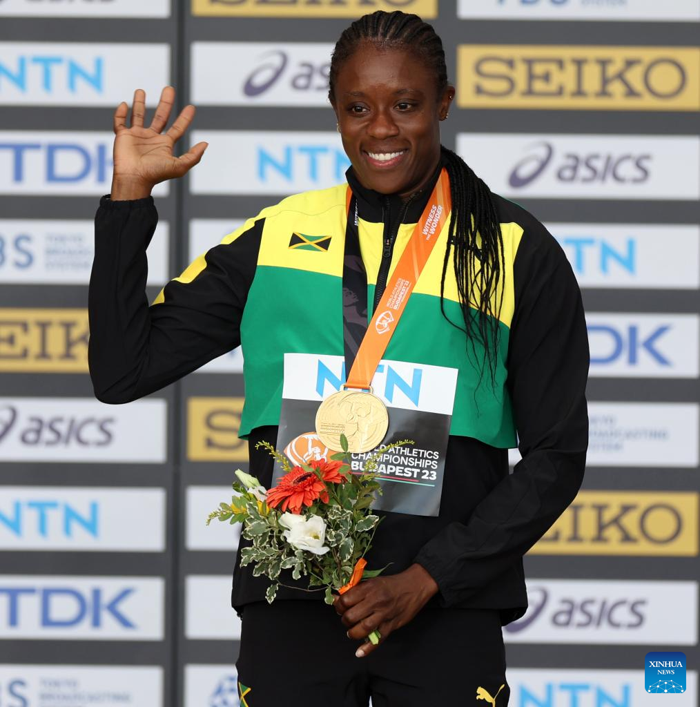 Gold medalist Danielle Williams of Jamaica celebrates during the awarding ceremony for the women's 100 meters hurdles final during the World Athletics Championships in Budapest, Hungary, Aug. 25, 2023. (Xinhua/Li Ying)