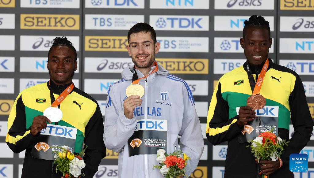Gold medalist Miltiadis Tentoglou (C) of Greece poses with silver medalist Wayne Pinnock (L) of Jamaica and bronze medalist Tajay Gayle of Jamaica during the awarding ceremony for the men's long jump final during the World Athletics Championships in Budapest, Hungary, Aug. 25, 2023. (Xinhua/Li Ying)