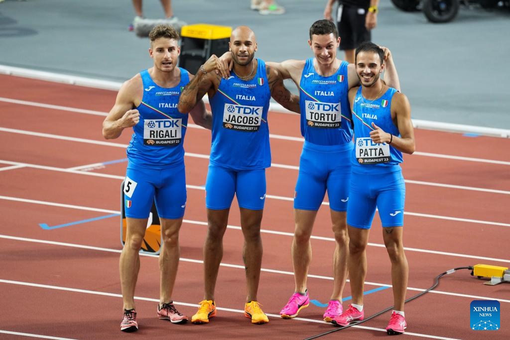 Roberto Rigali, Lamont Marcell Jacobs, Filippo Tortu and Lorenzo Patta (L to R) of Italy celebrate after the men's 4x100m Relay heats of the World Athletics Championships Budapest 2023 in Budapest, Hungary on Aug. 25, 2023. (Xinhua/Zheng Huansong)