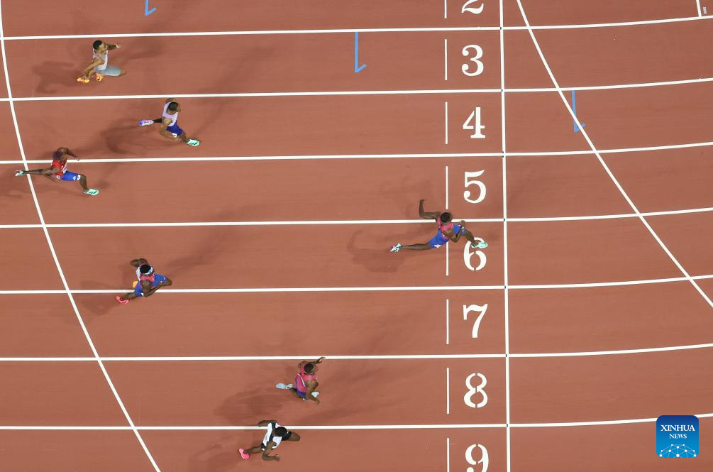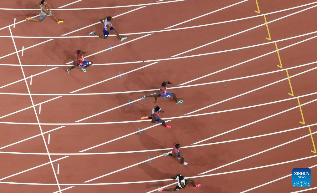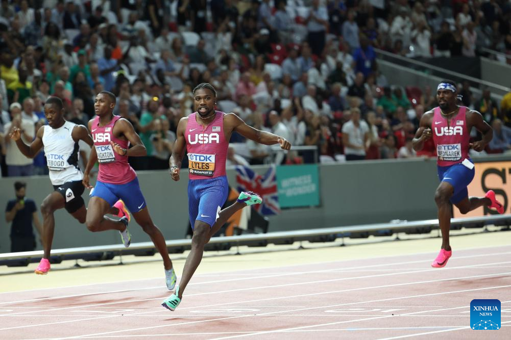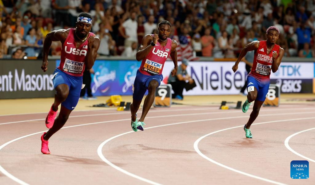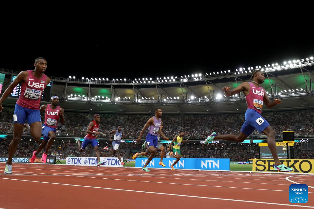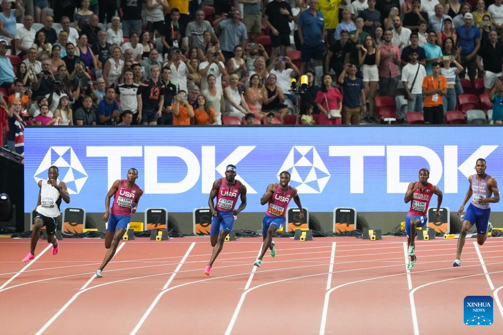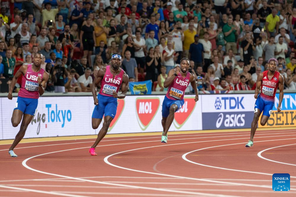 Noah Lyles (C) of the United States competes during the men's 200m final during the World Athletics Championships in Budapest, Hungary, Aug. 25, 2023. (Xinhua/Wang Lili)