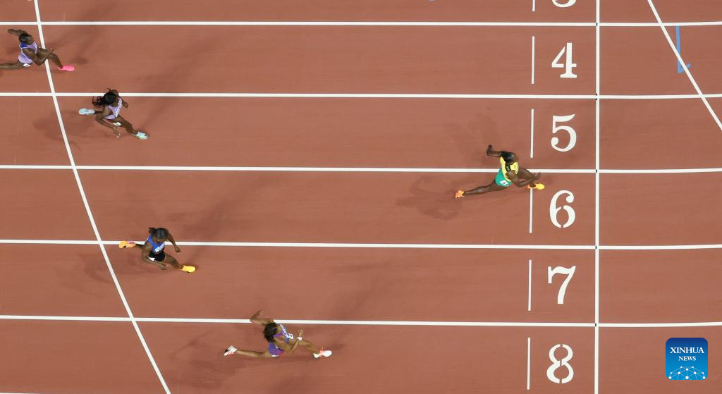 Shericka Jackson (1st R) of Jamaica crosses the finishing line during the women's 200 meters final during the World Athletics Championships in Budapest, Hungary, Aug. 25, 2023. (Xinhua/Li Ying)