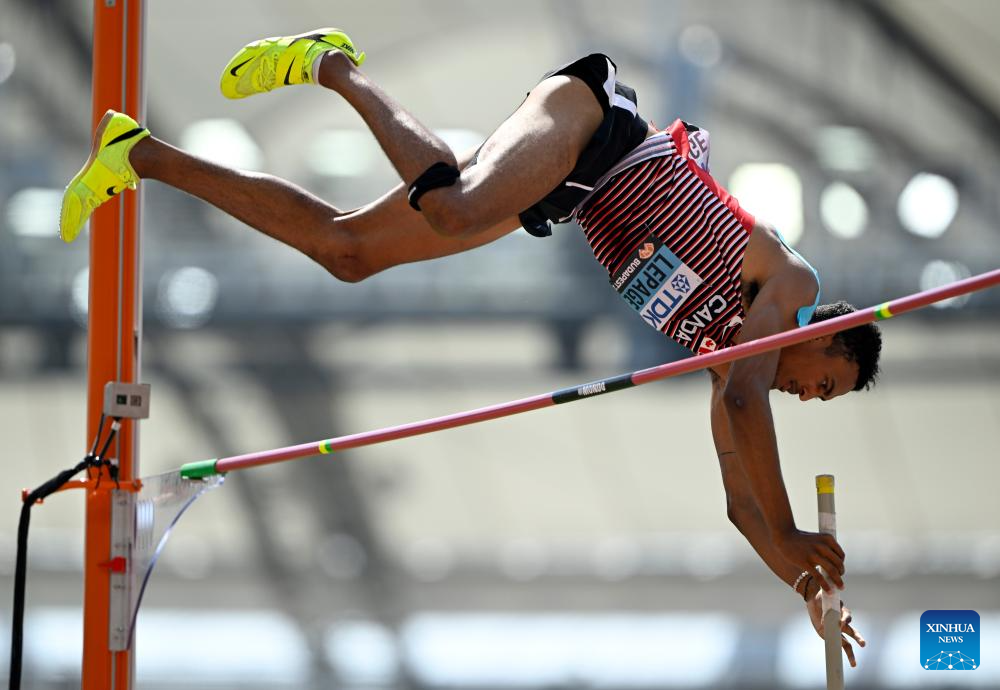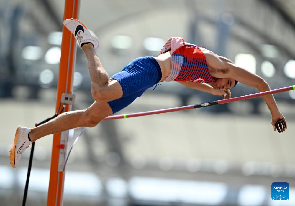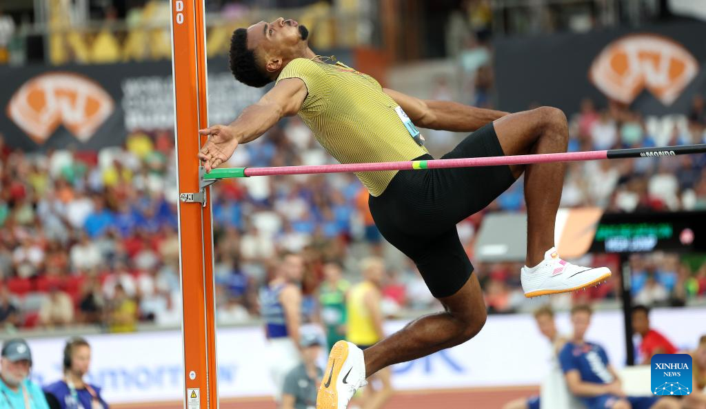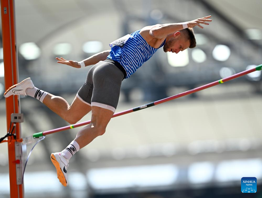 Leo Neugebauer of Germany competes during the men's Decathlon high jump of the World Athletics Championships Budapest 2023 in Budapest, Hungary on Aug. 25, 2023. (Xinhua/Li Ming)