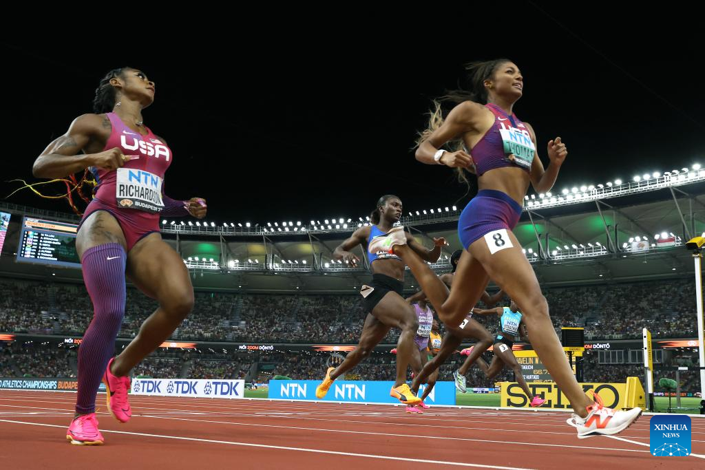 Gabrielle Thomas (R) and Sha'Carri Richardson (L) of the United States cross the finishing line during the women's 200 meters final during the World Athletics Championships in Budapest, Hungary, Aug. 25, 2023. (Xinhua/Li Ming)