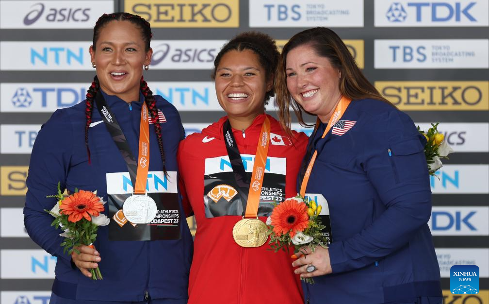 Gold medalist Camryn Rogers (C) of Canada poses with silver medalist Janee' Kassanavoid (L) of the United States and bronze medalist DeAnna Price of the United States during the awarding ceremony for the women's hammer throw final during the World Athletics Championships in Budapest, Hungary, Aug. 25, 2023. (Xinhua/Li Ying)