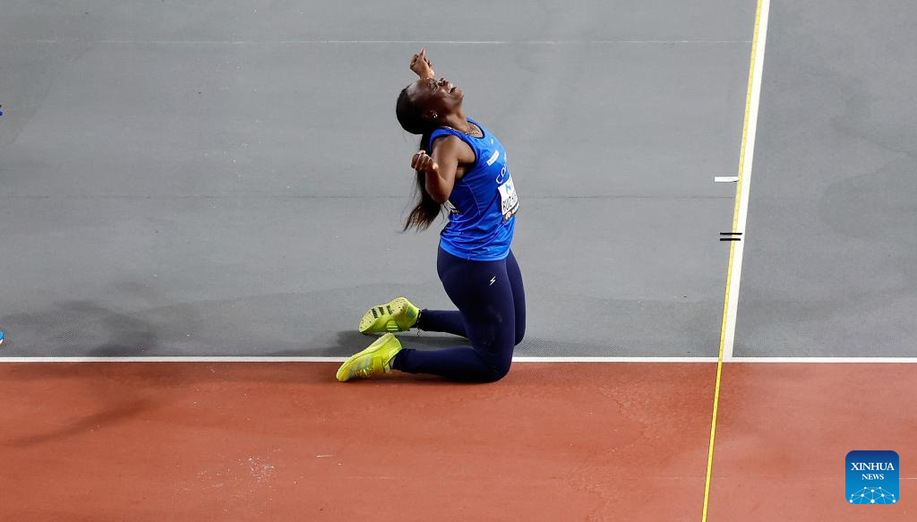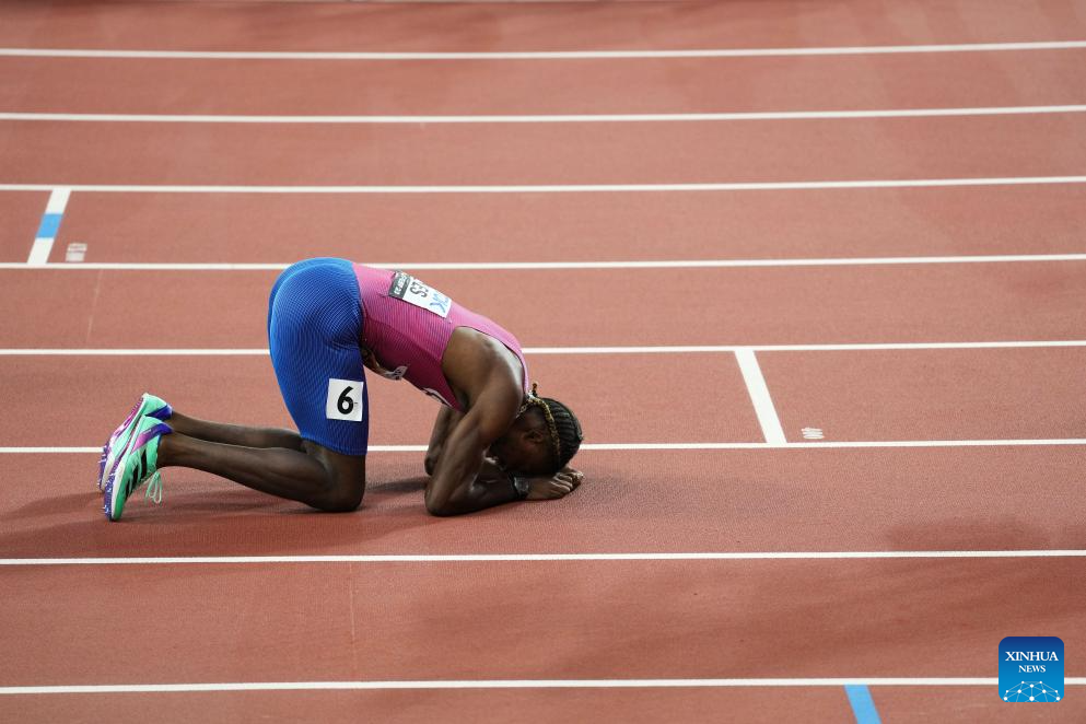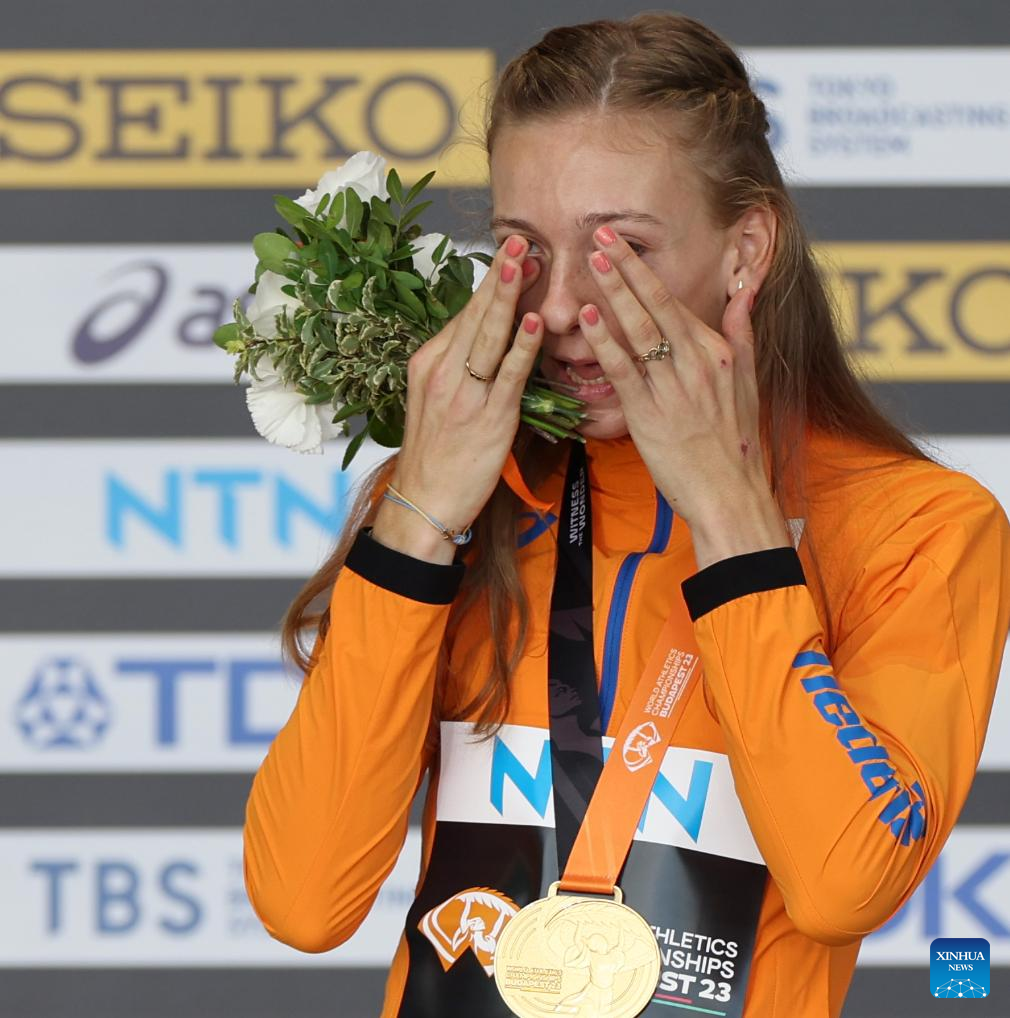 Gold medalist Femke Bol of the Netherlands reacts during the awarding ceremony for the women's 400 meters hurdles final during the World Athletics Championships in Budapest, Hungary, Aug. 25, 2023. (Xinhua/Li Ying)