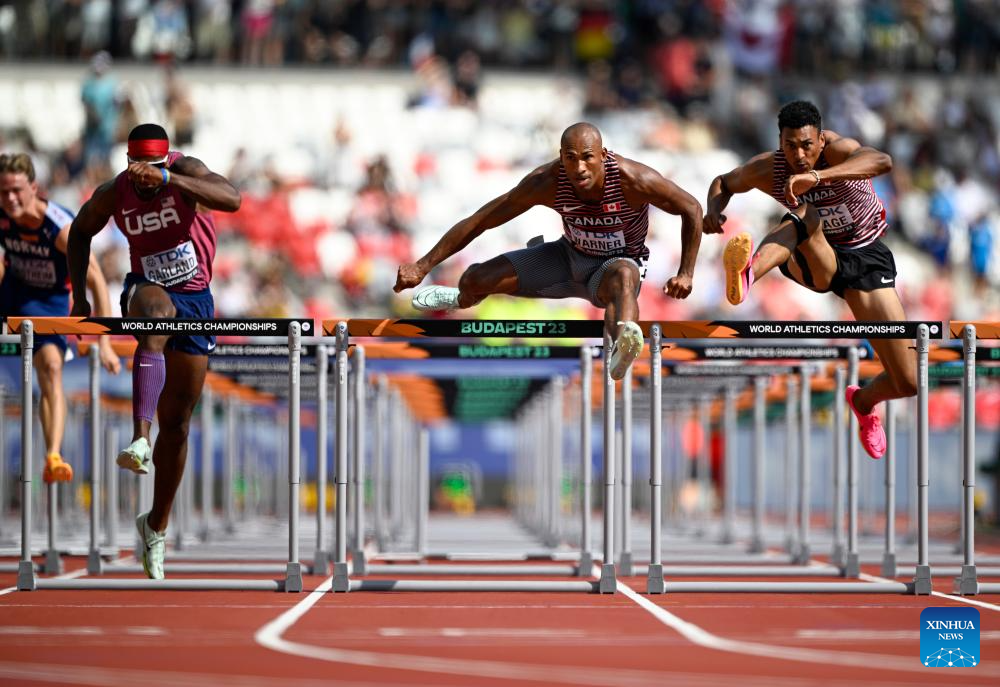 Canada's Pierce Lepage (R) and Damian Warner (C), and Kyle Garland of the United States compete during the Men's Decathlon 110m Hurdles of the World Athletics Championships Budapest 2023 in Budapest, Hungary on Aug. 26, 2023. (Xinhua/Song Yanhua)