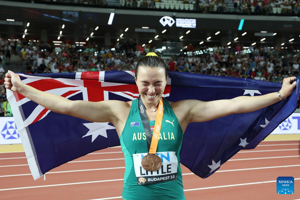 Bronze medalist Australia's Mackenzie Little celebrates after the women's javelin throw final during the World Athletics Championships in Budapest, Hungary, Aug. 25, 2023. (Xinhua/Li Ming)