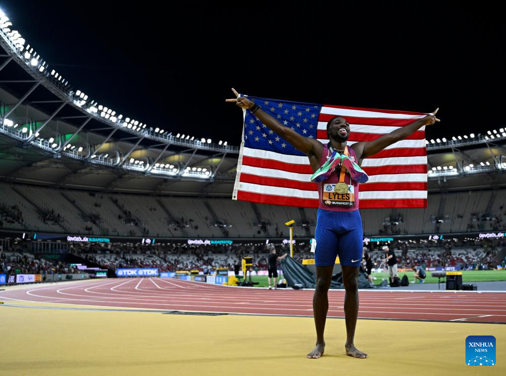 Noah Lyles of the United States celebrates after winning the men's 200m final during the World Athletics Championships in Budapest, Hungary, Aug. 25, 2023. (Xinhua/Li Ming)
