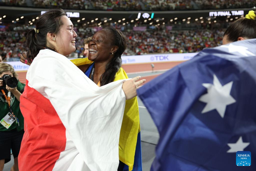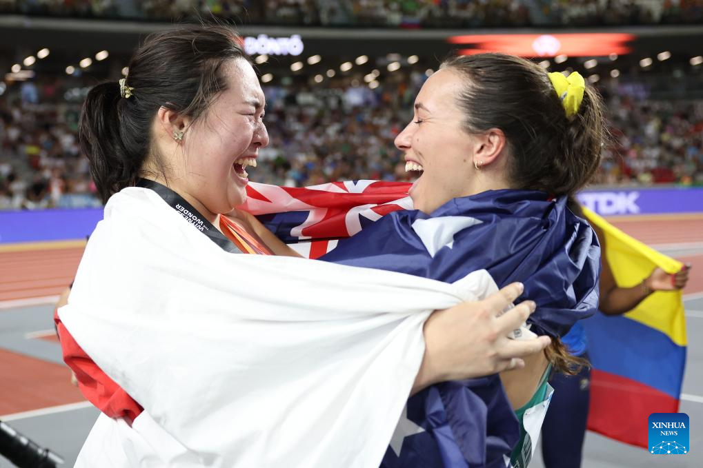 Gold medalist Japan's Kitaguchi Haruka (L) celebrates with silver medalist Colombia's Flor Denis Ruiz Hurtado after the women's javelin throw final during the World Athletics Championships in Budapest, Hungary, Aug. 25, 2023. (Xinhua/Li Ming)