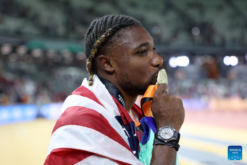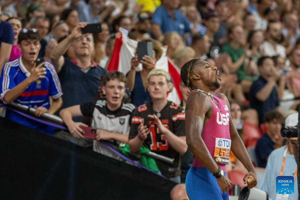 Noah Lyles of the United States celebrates after winning the men's 200m final during the World Athletics Championships in Budapest, Hungary, Aug. 25, 2023. (Xinhua/Meng Dingbo)