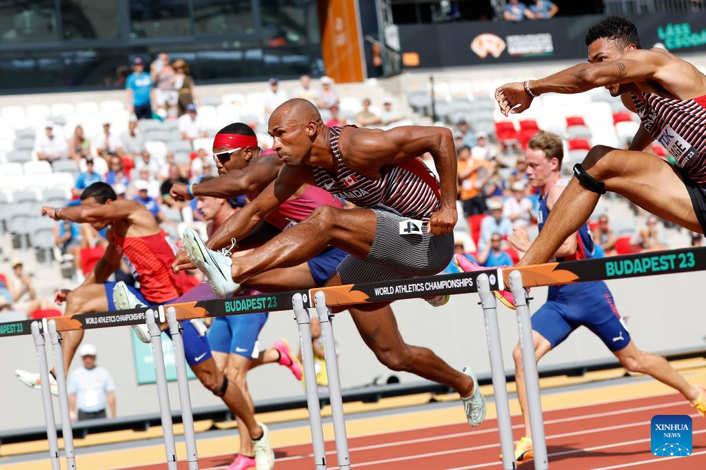 Damian Warner (Front, 2nd R) of Canada competes during the Men's Decathlon 110m Hurdles of the World Athletics Championships Budapest 2023 in Budapest, Hungary on Aug. 26, 2023. (Xinhua/Wang Lili)