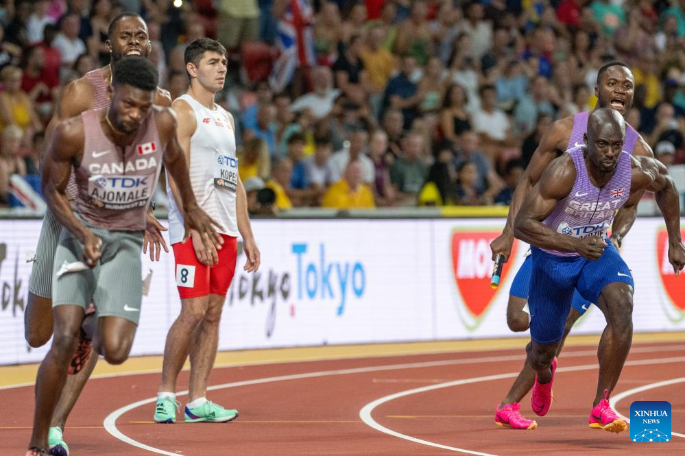 JT Smith of the United State (1st, L) competes during the men's 4x100m Relay heats of the World Athletics Championships Budapest 2023 in Budapest, Hungary on Aug. 25, 2023. (Xinhua/Zheng Huansong)
