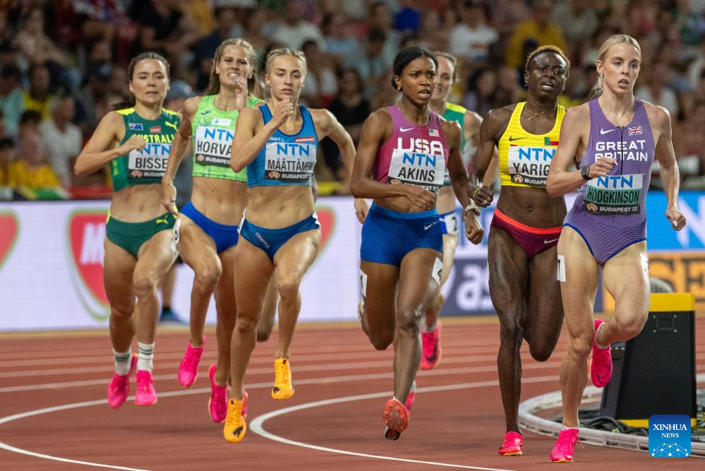 Keely Hodgkinson of Great Britain (R, Front) and Nia Akins (L, Front) of USA compete during the Women's 800m Semi-Final of the World Athletics Championships Budapest 2023 in Budapest, Hungary on Aug. 25, 2023. (Xinhua/Zheng Huansong)