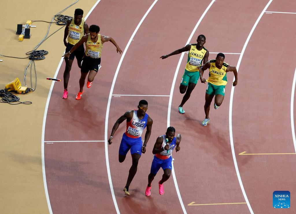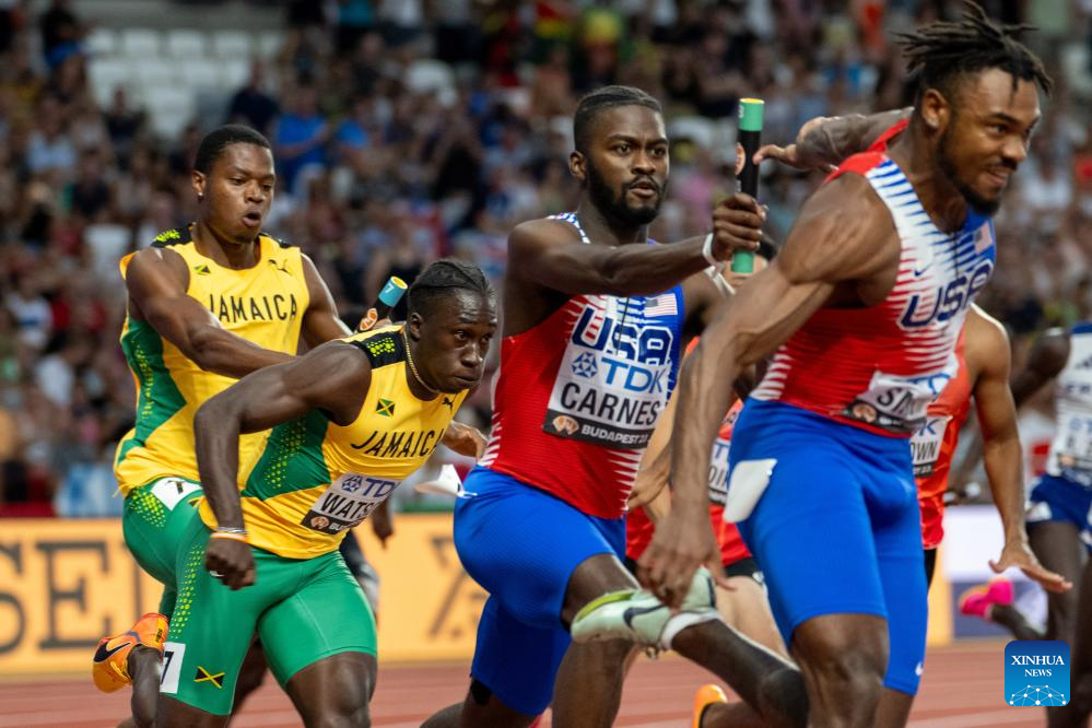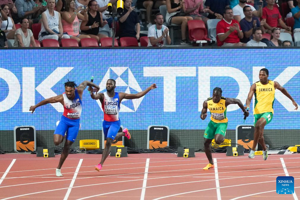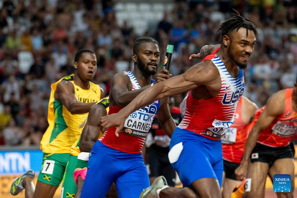 Team the United States, Team Jamaica and Team Japan (R to L) compete during the men's 4x100m Relay heats of the World Athletics Championships Budapest 2023 in Budapest, Hungary on Aug. 25, 2023. (Xinhua/Li Ying)