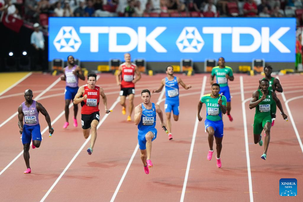 Filippo Tortu (C,Front) of Italy competes during the men's 4x100m Relay heats of the World Athletics Championships Budapest 2023 in Budapest, Hungary on Aug. 25, 2023. (Xinhua/Zheng Huansong)