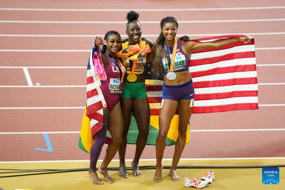 Gold medalist Shericka Jackson (C) of Jamaica, silver mealist Gabrielle Thomas (R) of the United States and bronze medalist Sha'Carri Richardson of the United States pose after the women's 200 meters final during the World Athletics Championships in Budapest, Hungary, Aug. 25, 2023. (Xinhua/Zheng Huansong)