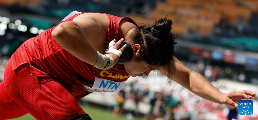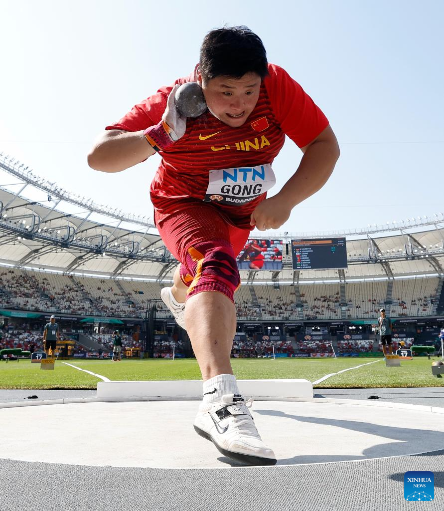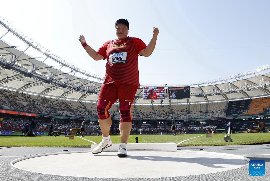 Gong Lijiao of China competes during the Women's Shot Put Qualification at the World Athletics Championships in Budapest, Hungary, Aug. 26, 2023. (Xinhua/Wang Lili)