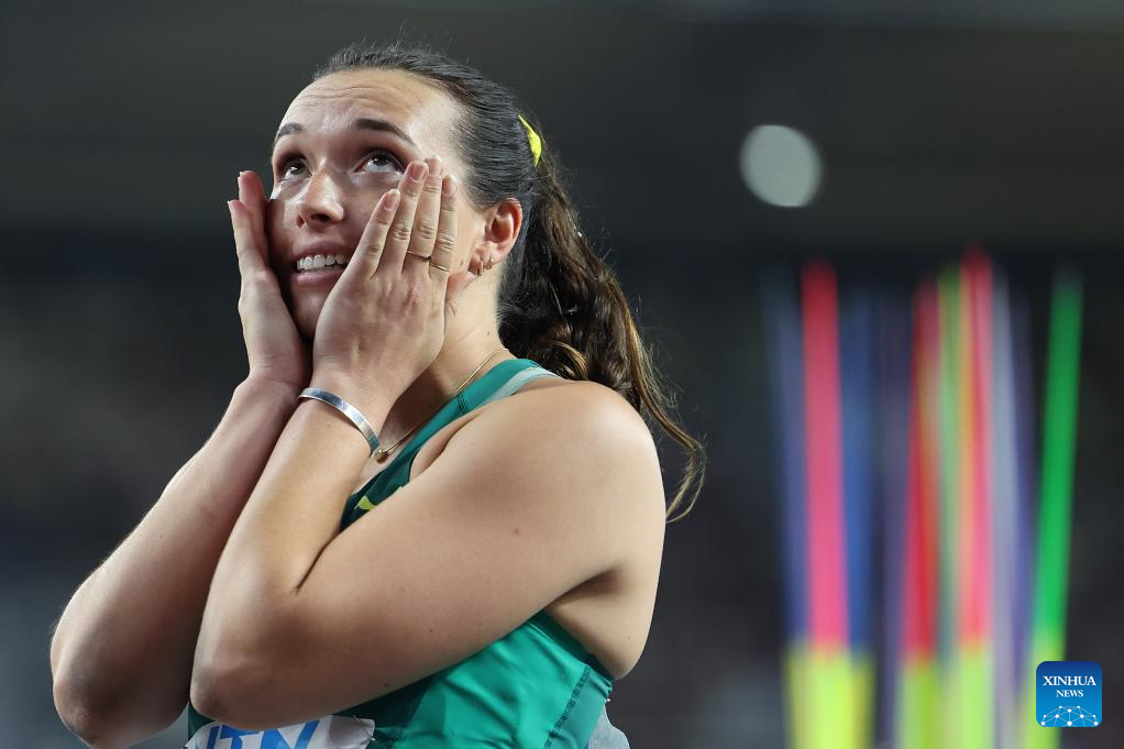 Bronze medalist Australia's Mackenzie Little reacts during the women's javelin throw final during the World Athletics Championships in Budapest, Hungary, Aug. 25, 2023. (Xinhua/Li Ming)