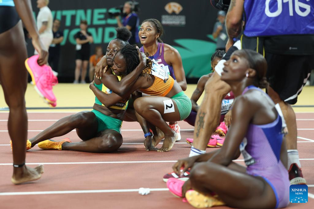 Shericka Jackson (1st L) of Jamaica celebrates with Marie-Josee Ta Lou of Cote Divoire after the women's 200 meters final during the World Athletics Championships in Budapest, Hungary, Aug. 25, 2023. (Xinhua/Li Ming)