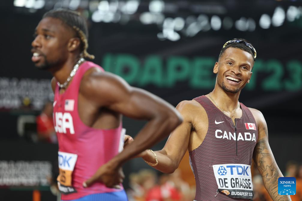 Andre De Grasse (R) of Canada and Noah Lyles of the United States greet each other after the men's 200m final during the World Athletics Championships in Budapest, Hungary, Aug. 25, 2023. (Xinhua/Li Ming)