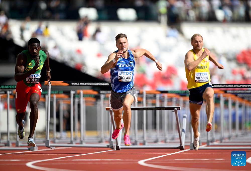 Janek Oiglane of Estonia (C) competes during the Men's Decathlon 110m Hurdles of the World Athletics Championships Budapest 2023 in Budapest, Hungary on Aug. 26, 2023. (Xinhua/Song Yanhua)