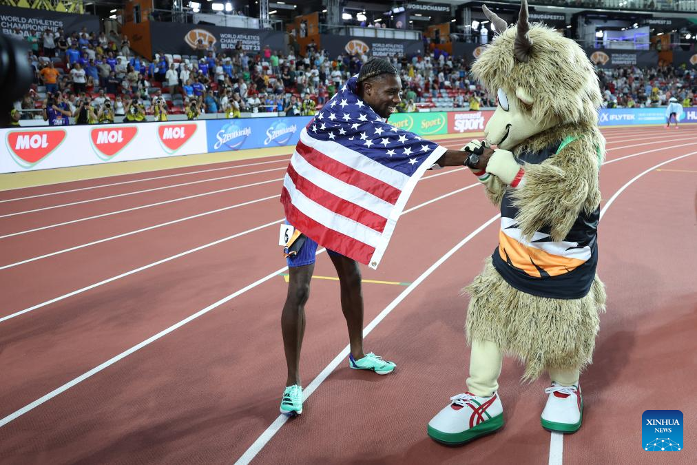 Noah Lyles of the United States celebrates with the mascot after winning the men's 200m final during the World Athletics Championships in Budapest, Hungary, Aug. 25, 2023. (Xinhua/Li Ming)