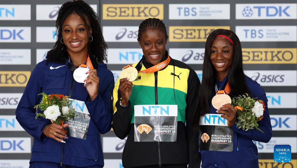 Gold medalist Danielle Williams (C) of Jamaica poses with silver medalist Jasmine Camacho-Quinn (L) of Puerto Rico and bronze medalist Kendra Harrison of the United States during the awarding ceremony for the women's 100 meters hurdles final during the World Athletics Championships in Budapest, Hungary, Aug. 25, 2023. (Xinhua/Li Ying)