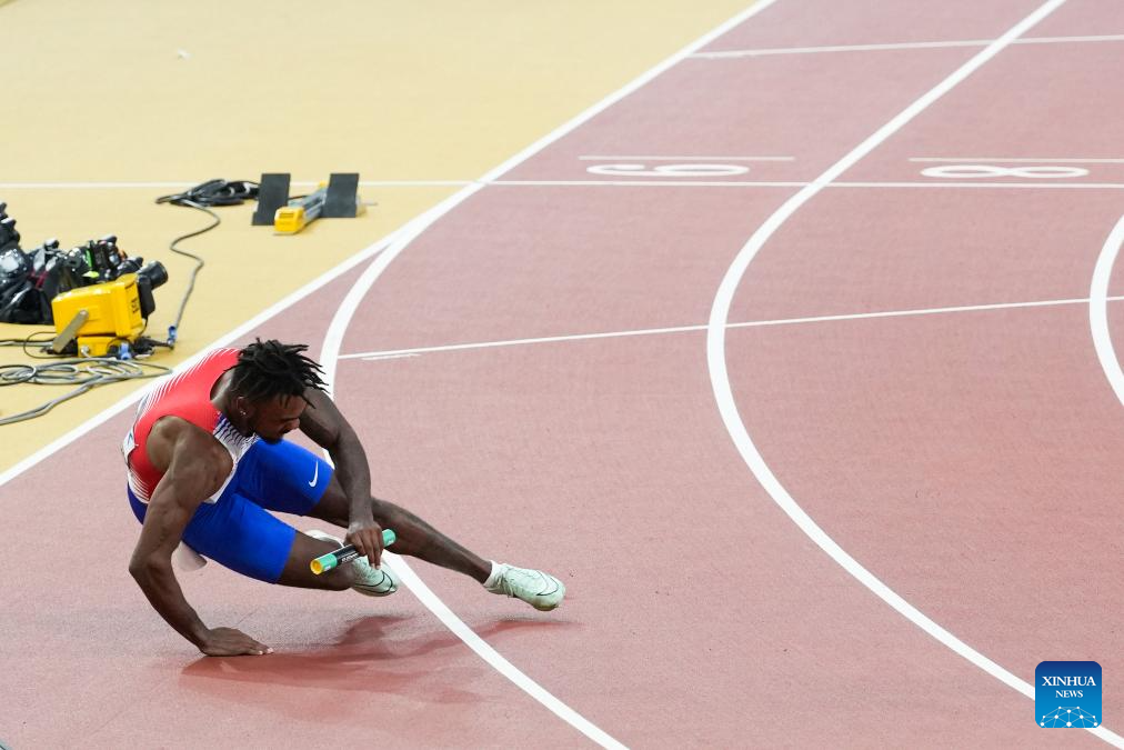JT Smith of the United States falls down after the the men's 4x100m Relay heats of the World Athletics Championships Budapest 2023 in Budapest, Hungary on Aug. 25, 2023. (Xinhua/Zheng Huansong)