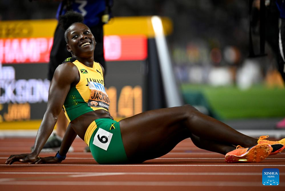 Shericka Jackson of Jamaica celebrates after winning the women's 200 meters final during the World Athletics Championships in Budapest, Hungary, Aug. 25, 2023. (Xinhua/Song Yanhua)