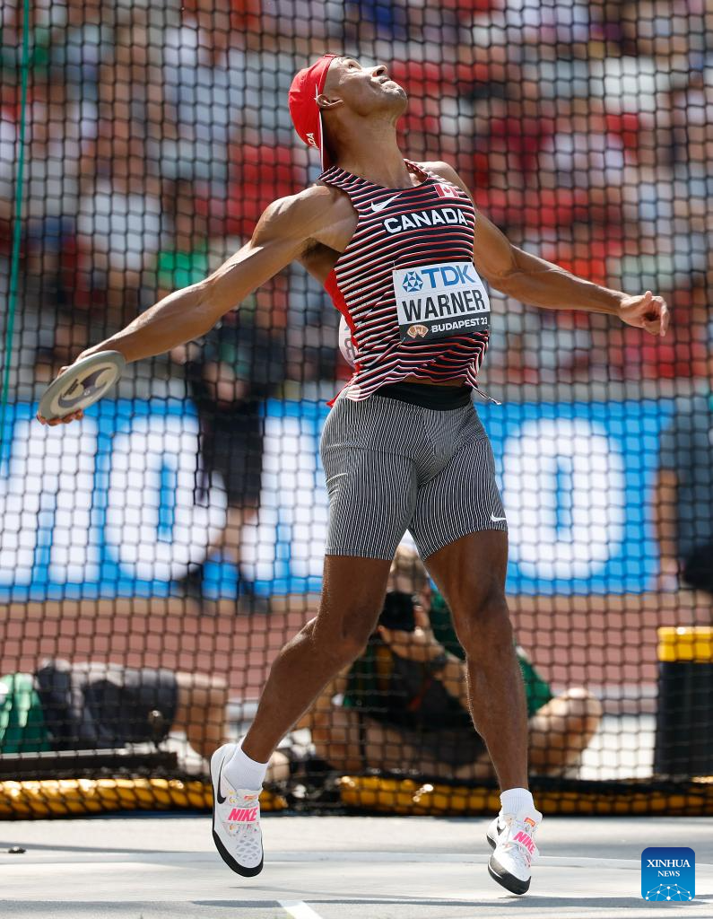 Damian Warner of Canada competes during the Men's Decathlon Discus Throw of the World Athletics Championships Budapest 2023 in Budapest, Hungary on Aug. 26, 2023. (Xinhua/Wang Lili)