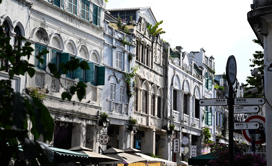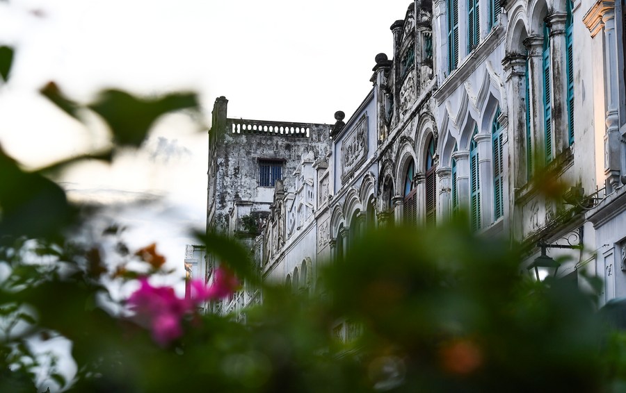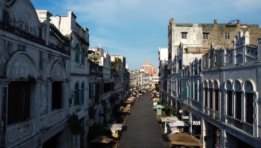 This photo taken on Aug. 20, 2023 shows part of buildings at the Qilou old street in Haikou, south China's Hainan Province. (Xinhua/Yang Guanyu)