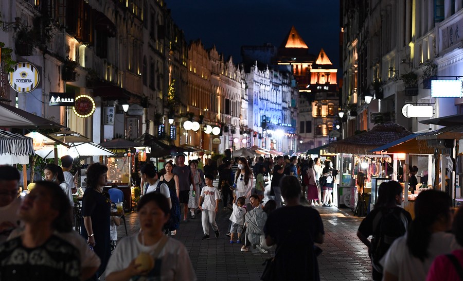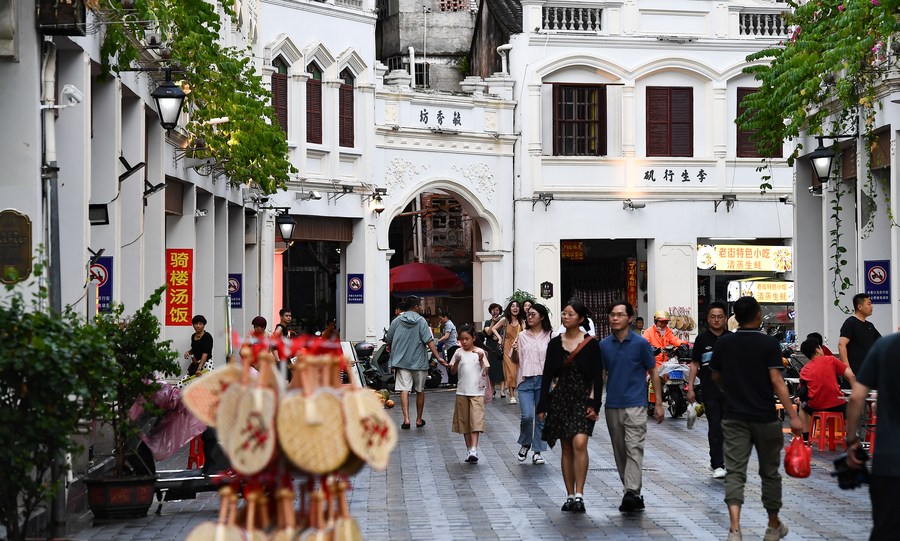 Tourists visit the Qilou old street in Haikou, south China's Hainan Province, Aug. 21, 2023. (Xinhua/Yang Guanyu)